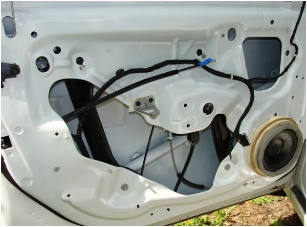 - При завершении процедуру, дверь можно извлекать из корпуса автомобиля, предварительно отключив клеммы питания стеклоподъемниками. Чтобы снять стекло из демонтированной двери требуется его полностью отпустить и открутить крепления ключом на 10, после чего стекло легко вынимается движением вверх.