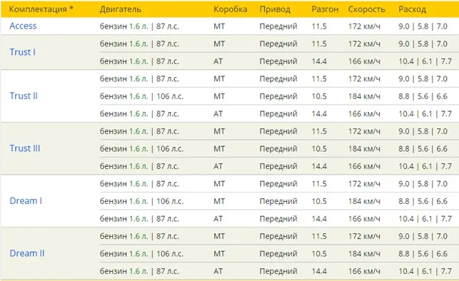 - Welcome: базовая версия с силовым агрегатом объемом 1.6 литра, мощностью 102 л.с., механической коробкой передач. Тип привода: передний, разгон до сотни за 10.9 сек. Максимальная скорость в 185 км /час. Расход топлива (город / трасса / средний): 9.5 / 5.8 / 7.2 литра / 100 км;
